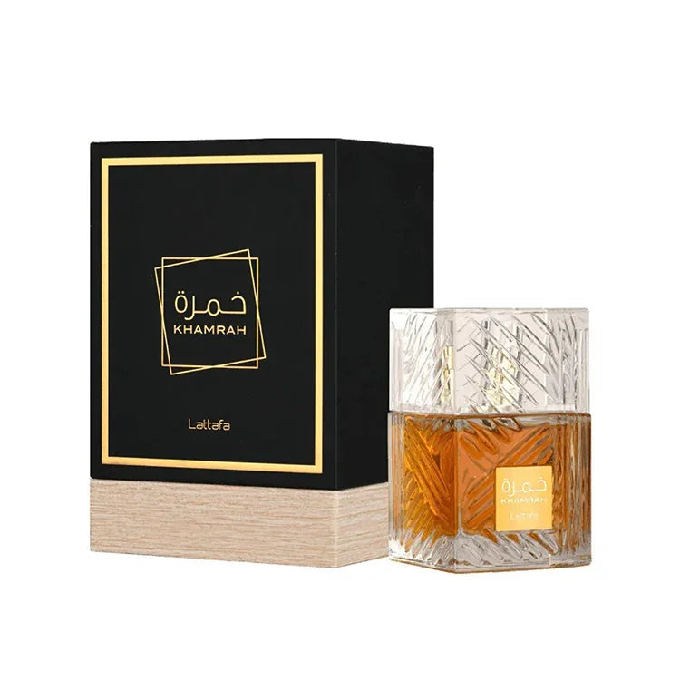 The Lattafa Khamrah Eau de Parfum is a unisex fragrance that exudes luxury and oriental spice. Crafted by the esteemed Arab luxury perfume brand Lattafa Perfumes, this exquisite scent is contained within a lavish crystal bottle. At the top, Khamrah greets the senses with a burst of fresh bergamot, complemented by the warm and velvety spice of cinnamon and refined clary sage. The heart of the fragrance is characterized by the delightful creamy scent of praline, surrounded by sweet fruity notes and the subtle floral hints of tuberose. Finally, the base of Lattafa Khamrah envelops the wearer in an aromatic trail of sensual vanilla sweetness blended with precious woods, smoky oud, myrrh, tonka bean, and benzoin resin, leaving a soft shimmer in its wake.